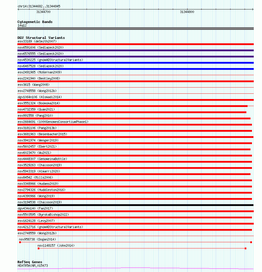 Variant DetailsVariant: essv6732391| Internal ID | 10143195 | | Landmark | | | Location Information | | | Cytoband | 14q12 | | Allele length | | Assembly | Allele length | | hg38 | 164 | | hg19 | 164 |