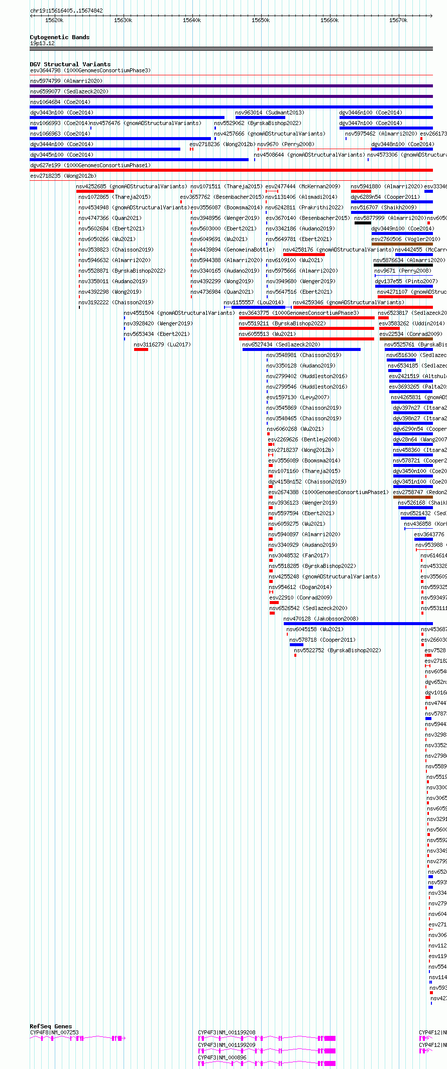 Variant DetailsVariant: essv6733151| Internal ID | 10142653 | | Landmark | | | Location Information | | | Cytoband | 19p13.12 | | Allele length | | Assembly | Allele length | | hg38 | 58438 | | hg19 | 58437 |