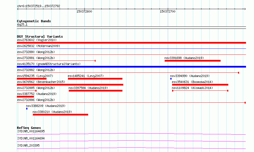 Variant DetailsVariant: essv6734440Internal ID | 9797057 | Landmark | | Location Information | | Cytoband | 6q25.1 | Allele length | Assembly | Allele length | hg38 | 274 | hg19 | 274 |