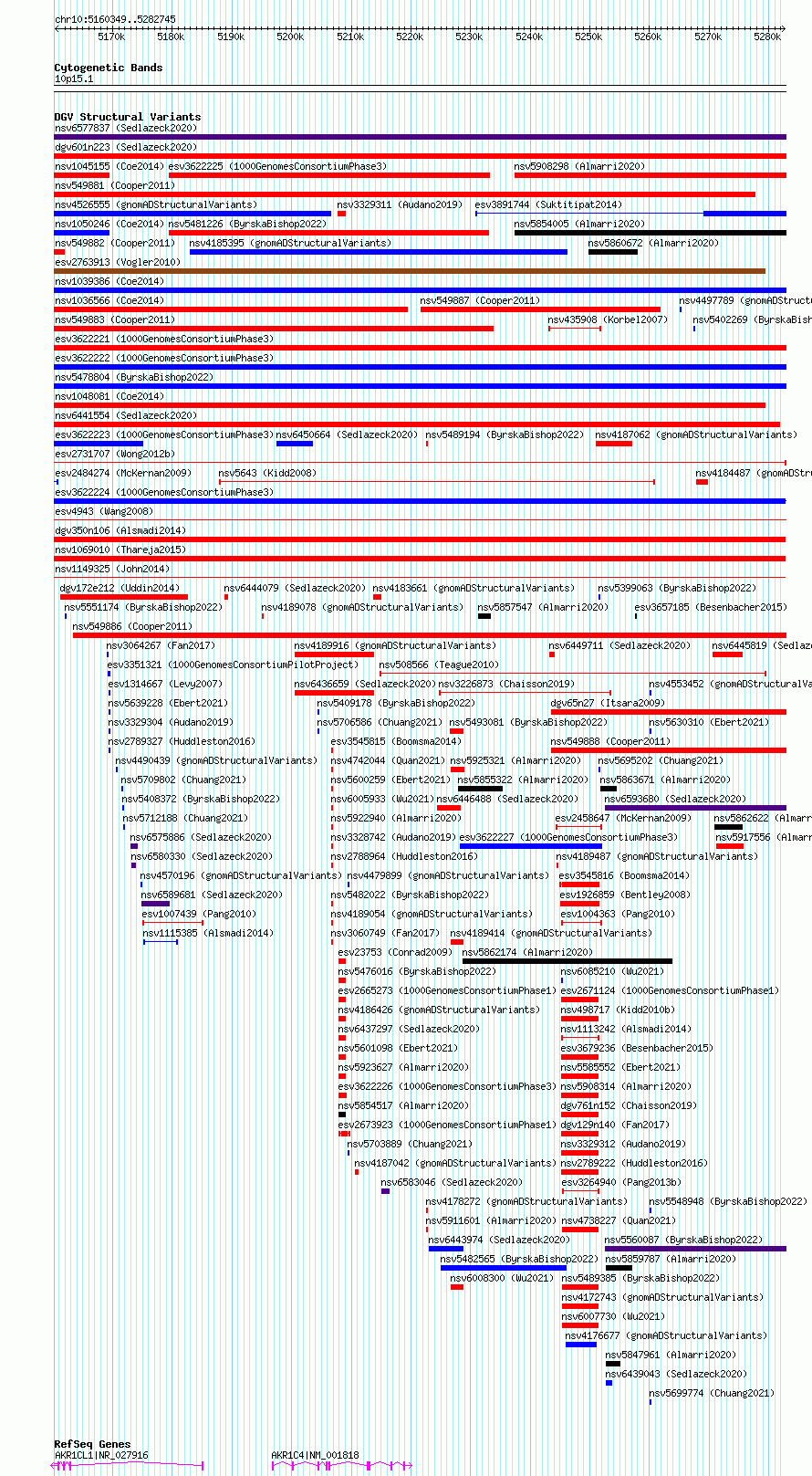 Variant DetailsVariant: essv6734946| Internal ID | 10145538 | | Landmark | | | Location Information | | | Cytoband | 10p15.1 | | Allele length | | Assembly | Allele length | | hg38 | 122397 | | hg19 | 122397 |
