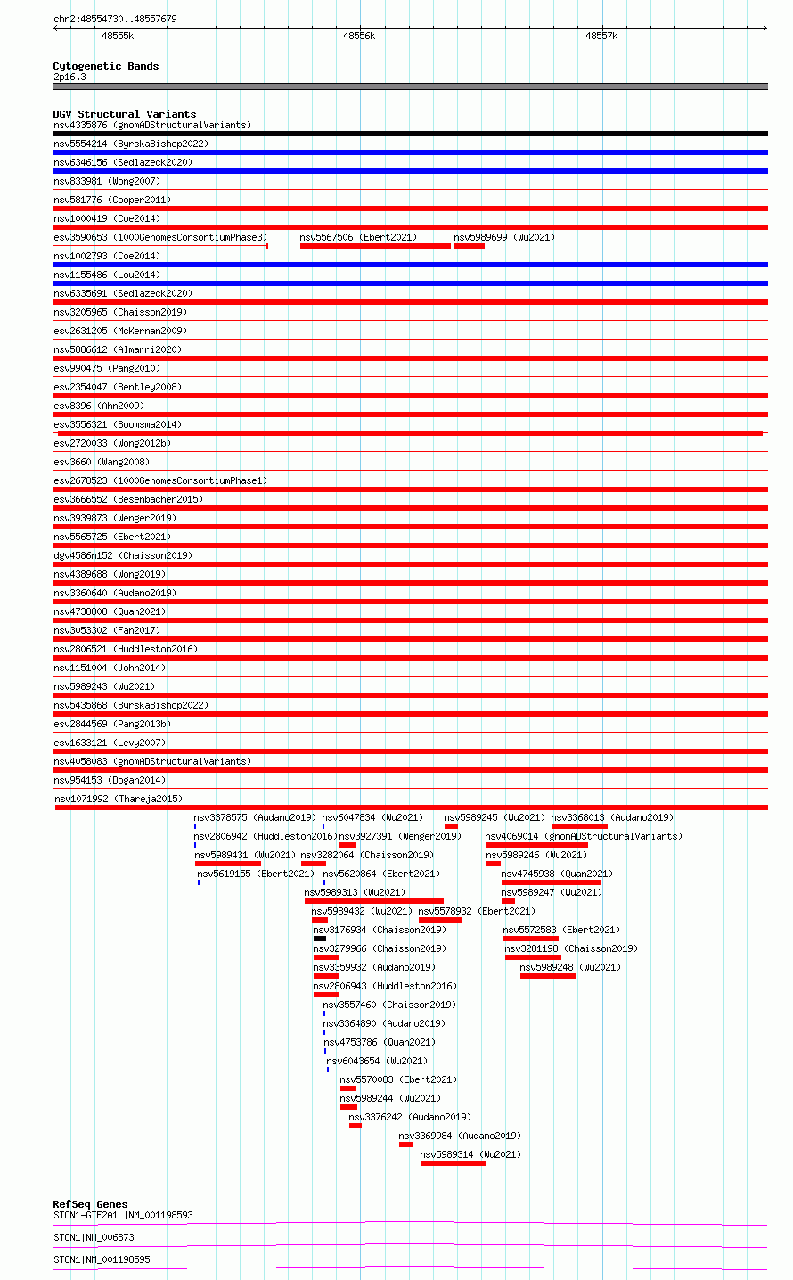 Variant DetailsVariant: essv6736213| Internal ID | 10146074 | | Landmark | | | Location Information | | | Cytoband | 2p16.3 | | Allele length | | Assembly | Allele length | | hg38 | 2950 | | hg19 | 2950 |