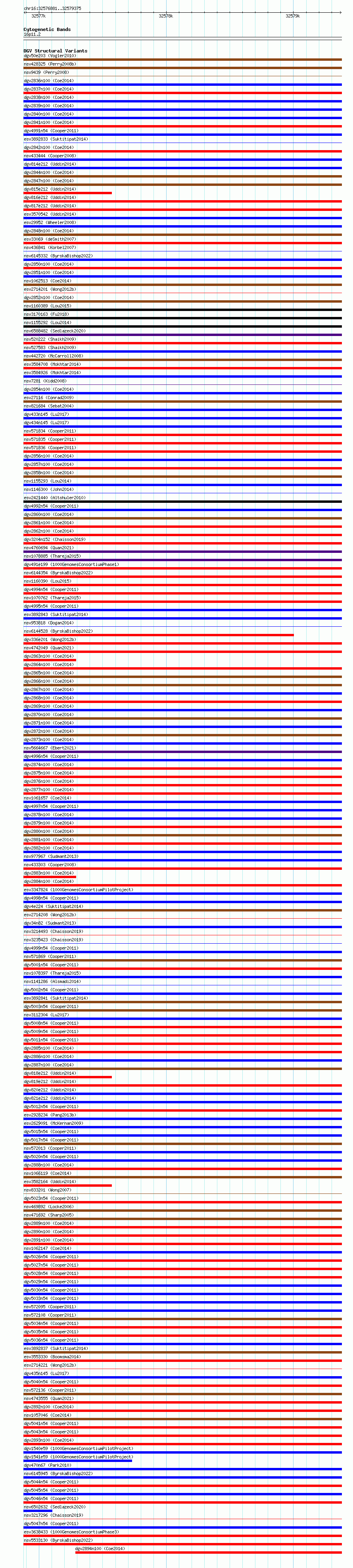 Variant DetailsVariant: essv6742131| Internal ID | 9999139 | | Landmark | | | Location Information | | | Cytoband | 16p11.2 | | Allele length | | Assembly | Allele length | | hg38 | 2495 | | hg19 | 2495 |