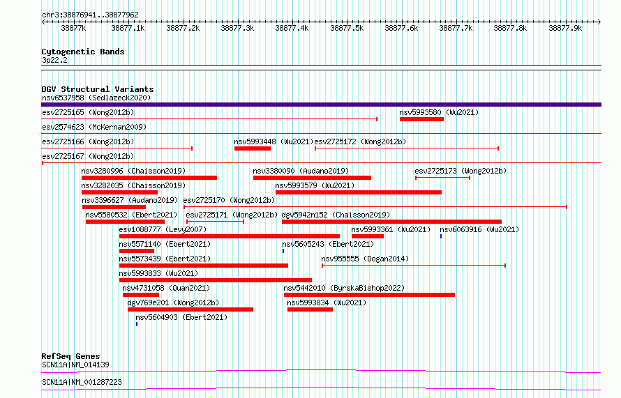 | | Variant Type | CNV deletion | | Copy Number | | | Allele State | | | Allele Origin | | | Probe Count | | | Validation Flag | | | Merged Status | S | | Merged Variants | esv2725165, esv2725167 | | Supporting Variants | | | Samples | SSM053 | | Known Genes | SCN11A | | Method | Sequencing | | Analysis | Breakdancer:4 times standard deviation,VariationHunter:4 times standard deviation and at least 3 supportting reads | | Platform | Illumina HiSeq 2000 | | Comments | | | Reference | Wong_et_al_2012b | | Pubmed ID | 23290073 | | Accession Number(s) | essv6742552