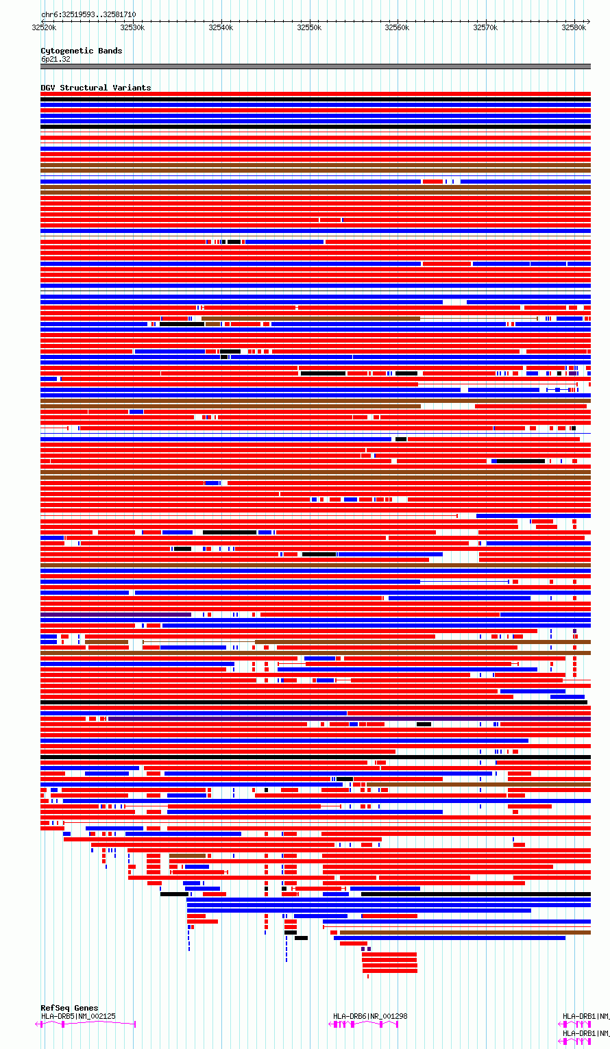 Variant DetailsVariant: essv6743157| Internal ID | 10153853 | | Landmark | | | Location Information | | | Cytoband | 6p21.32 | | Allele length | | Assembly | Allele length | | hg38 | 62118 | | hg19 | 62118 |