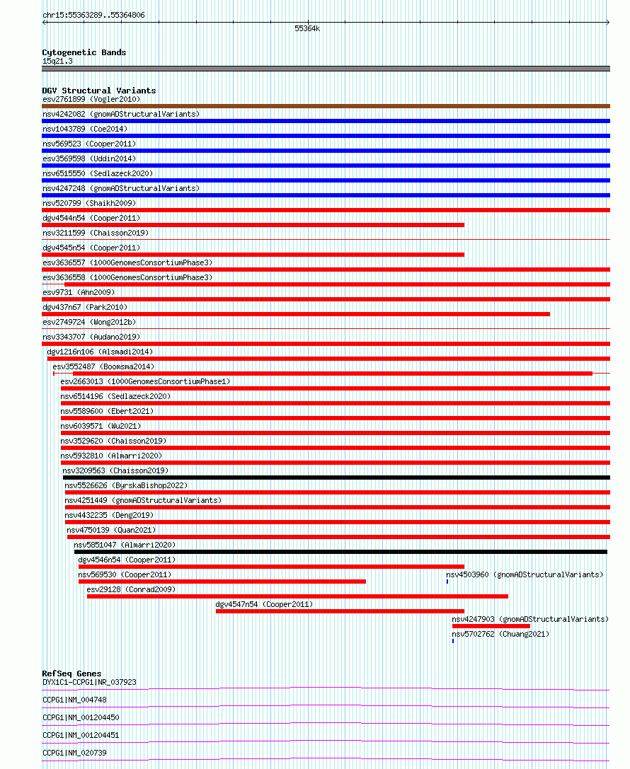 | | Variant Type | CNV deletion | | Copy Number | | | Allele State | | | Allele Origin | | | Probe Count | | | Validation Flag | | | Merged Status | S | | Merged Variants | esv2749724 | | Supporting Variants | | | Samples | SSM055 | | Known Genes | CCPG1, DYX1C1-CCPG1 | | Method | Sequencing | | Analysis | Breakdancer:4 times standard deviation,VariationHunter:4 times standard deviation and at least 3 supportting reads | | Platform | Illumina HiSeq 2000 | | Comments | | | Reference | Wong_et_al_2012b | | Pubmed ID | 23290073 | | Accession Number(s) | essv6747145