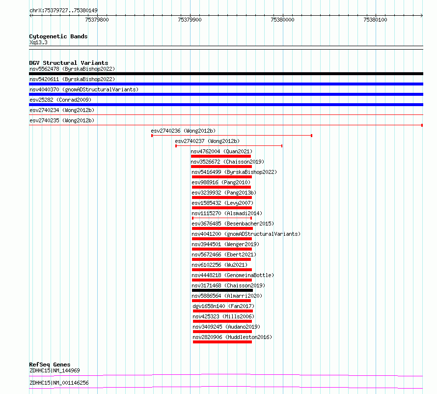 Variant DetailsVariant: essv6749125| Internal ID | 10158923 | | Landmark | | | Location Information | | | Cytoband | Xq13.3 | | Allele length | | Assembly | Allele length | | hg38 | 423 | | hg19 | 423 |