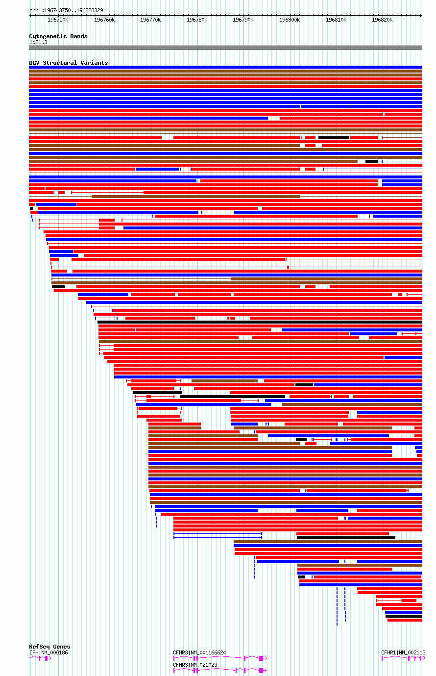 | | Variant Type | CNV deletion | | Copy Number | | | Allele State | | | Allele Origin | | | Probe Count | | | Validation Flag | | | Merged Status | S | | Merged Variants | esv2721006 | | Supporting Variants | | | Samples | SSM008 | | Known Genes | CFH, CFHR1, CFHR3 | | Method | Sequencing | | Analysis | Breakdancer:4 times standard deviation,VariationHunter:4 times standard deviation and at least 3 supportting reads | | Platform | Illumina HiSeq 2000 | | Comments | | | Reference | Wong_et_al_2012b | | Pubmed ID | 23290073 | | Accession Number(s) | essv6749843
