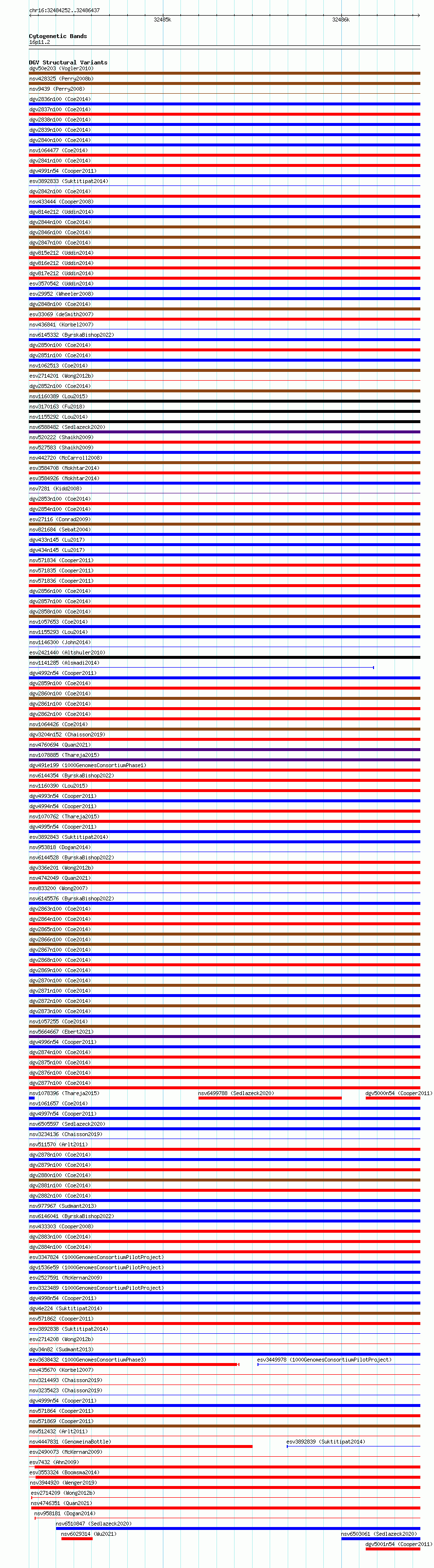 Variant DetailsVariant: essv6750027| Internal ID | 10157814 | | Landmark | | | Location Information | | | Cytoband | 16p11.2 | | Allele length | | Assembly | Allele length | | hg38 | 2186 | | hg19 | 2186 |