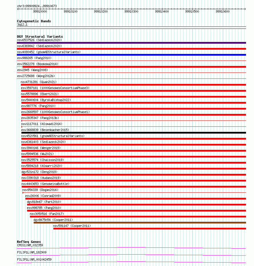 Variant DetailsVariant: essv6751045| Internal ID | 10160097 | | Landmark | | | Location Information | | | Cytoband | 3q12.1 | | Allele length | | Assembly | Allele length | | hg38 | 750 | | hg19 | 750 |