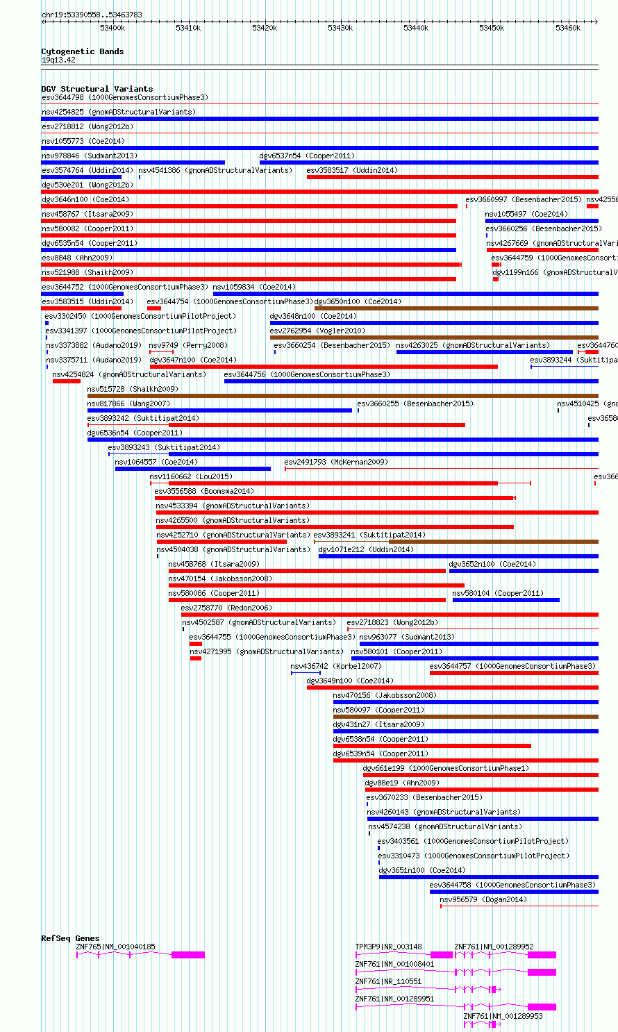 Variant DetailsVariant: essv6753344| Internal ID | 9814575 | | Landmark | | | Location Information | | | Cytoband | 19q13.42 | | Allele length | | Assembly | Allele length | | hg38 | 73226 | | hg19 | 73227 |