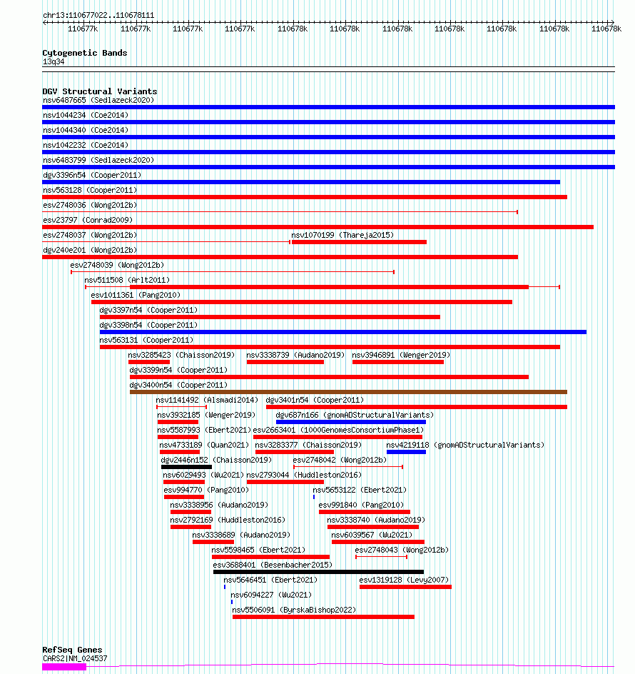 Variant DetailsVariant: essv6755741| Internal ID | 10163559 | | Landmark | | | Location Information | | | Cytoband | 13q34 | | Allele length | | Assembly | Allele length | | hg38 | 1090 | | hg19 | 1090 |