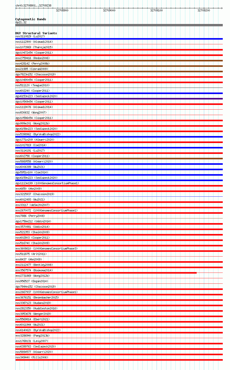 Variant DetailsVariant: essv6757391| Internal ID | 10166000 | | Landmark | | | Location Information | | | Cytoband | 6p21.32 | | Allele length | | Assembly | Allele length | | hg38 | 438 | | hg19 | 438 |