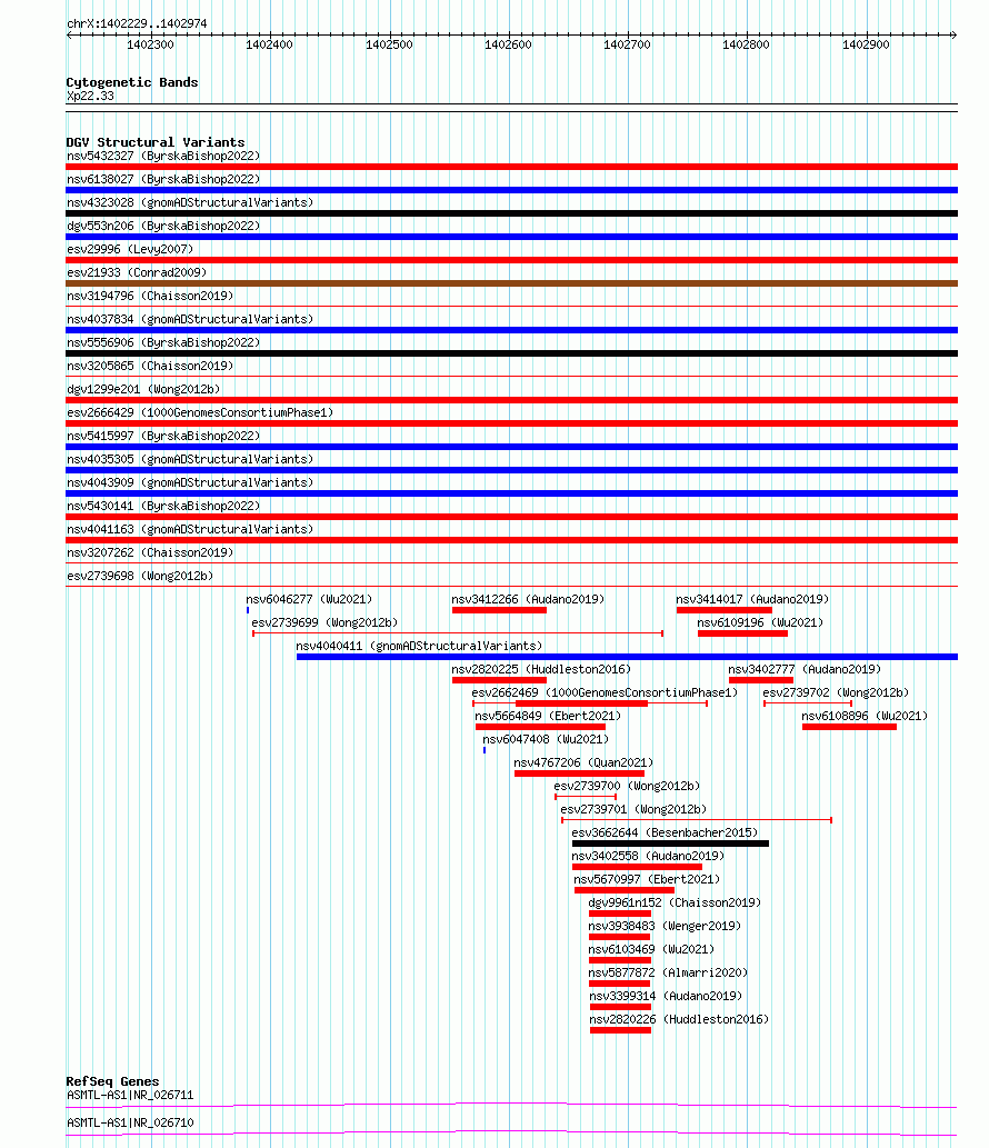 Variant DetailsVariant: essv6757691| Internal ID | 10165730 | | Landmark | | | Location Information | | | Cytoband | Xp22.33 | | Allele length | | Assembly | Allele length | | hg38 | 746 | | hg19 | 746 |