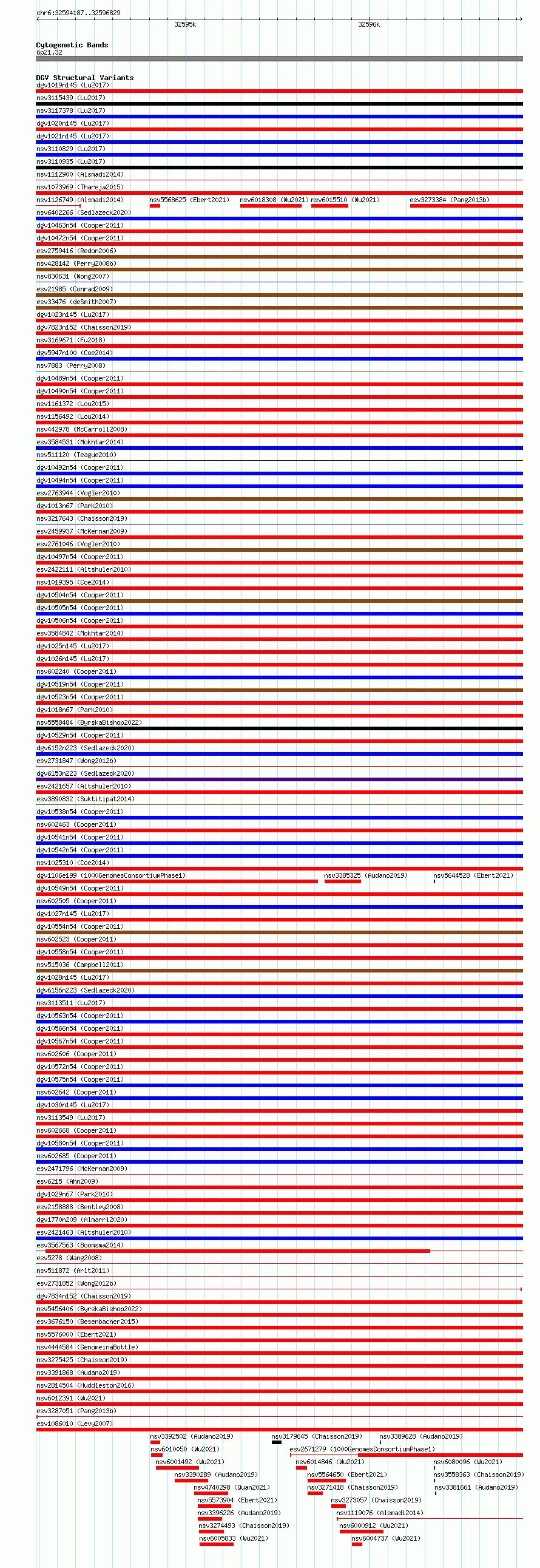 Variant DetailsVariant: essv6760021| Internal ID | 10167300 | | Landmark | | | Location Information | | | Cytoband | 6p21.32 | | Allele length | | Assembly | Allele length | | hg38 | 2643 | | hg19 | 2643 |