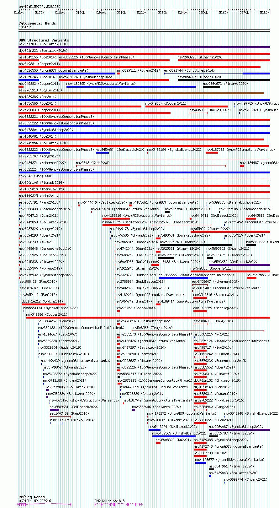 Variant DetailsVariant: essv6760702| Internal ID | 10167914 | | Landmark | | | Location Information | | | Cytoband | 10p15.1 | | Allele length | | Assembly | Allele length | | hg38 | 122504 | | hg19 | 122269 |