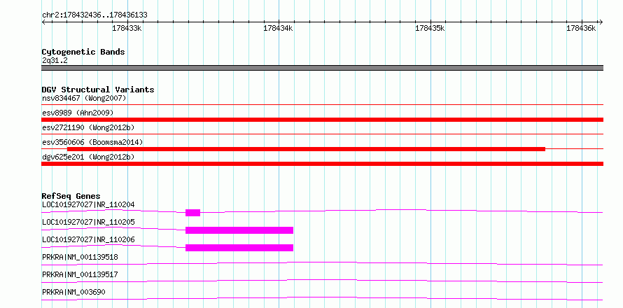 | Variant Type | CNV deletion | Copy Number | | Allele State | | Allele Origin | | Probe Count | | Validation Flag | | Merged Status | S | Merged Variants | esv2721190 | Supporting Variants | | Samples | SSM062 | Known Genes | MIR548N, PRKRA | Method | Sequencing | Analysis | Breakdancer:4 times standard deviation,VariationHunter:4 times standard deviation and at least 3 supportting reads | Platform | Illumina HiSeq 2000 | Comments | | Reference | Wong_et_al_2012b | Pubmed ID | 23290073 | Accession Number(s) | essv6762097