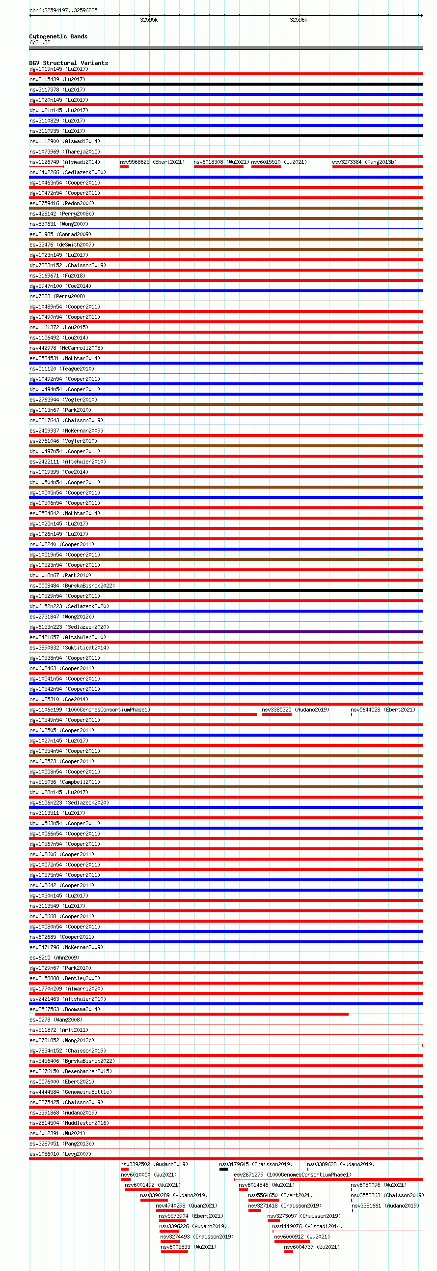 Variant DetailsVariant: essv6762633| Internal ID | 10171069 | | Landmark | | | Location Information | | | Cytoband | 6p21.32 | | Allele length | | Assembly | Allele length | | hg38 | 2629 | | hg19 | 2629 |