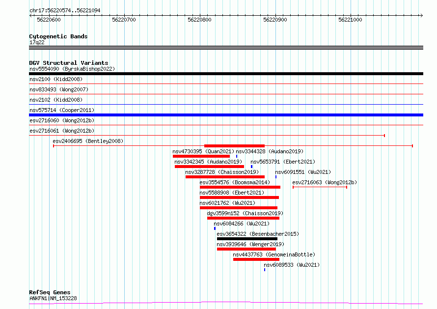 Variant DetailsVariant: essv6762930| Internal ID | 9983299 | | Landmark | | | Location Information | | | Cytoband | 17q22 | | Allele length | | Assembly | Allele length | | hg38 | 521 | | hg19 | 521 |