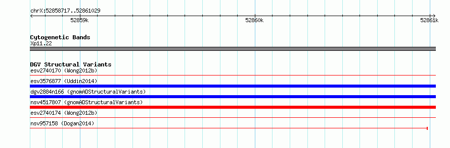Variant DetailsVariant: essv6765299| Internal ID | 9654639 |  | Landmark |  |  | Location Information |  |  | Cytoband | Xp11.22 |  | Allele length | | Assembly | Allele length |  | hg38 | 2313 |  | hg19 | 2313 |