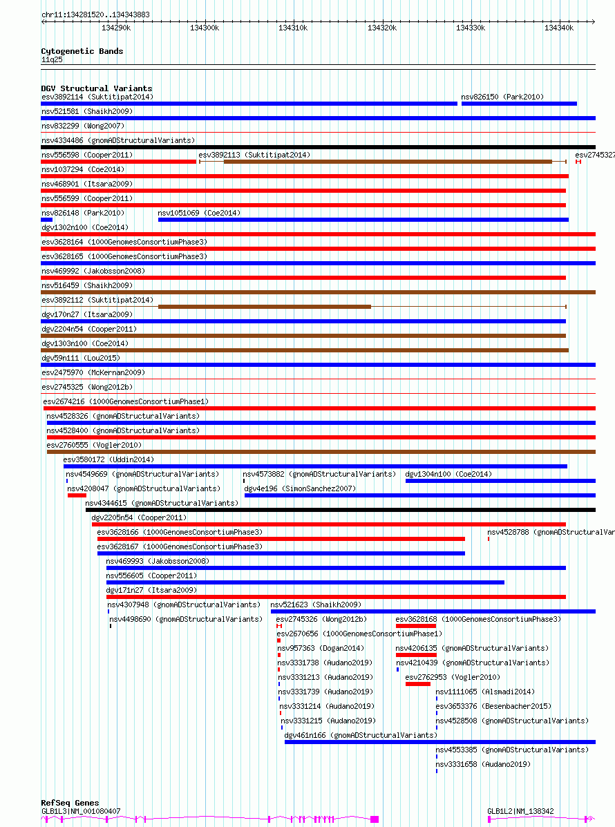 | | Variant Type | CNV deletion | | Copy Number | | | Allele State | | | Allele Origin | | | Probe Count | | | Validation Flag | | | Merged Status | S | | Merged Variants | esv2745325 | | Supporting Variants | | | Samples | SSM063 | | Known Genes | GLB1L2, GLB1L3 | | Method | Sequencing | | Analysis | Breakdancer:4 times standard deviation,VariationHunter:4 times standard deviation and at least 3 supportting reads | | Platform | Illumina HiSeq 2000 | | Comments | | | Reference | Wong_et_al_2012b | | Pubmed ID | 23290073 | | Accession Number(s) | essv6765738