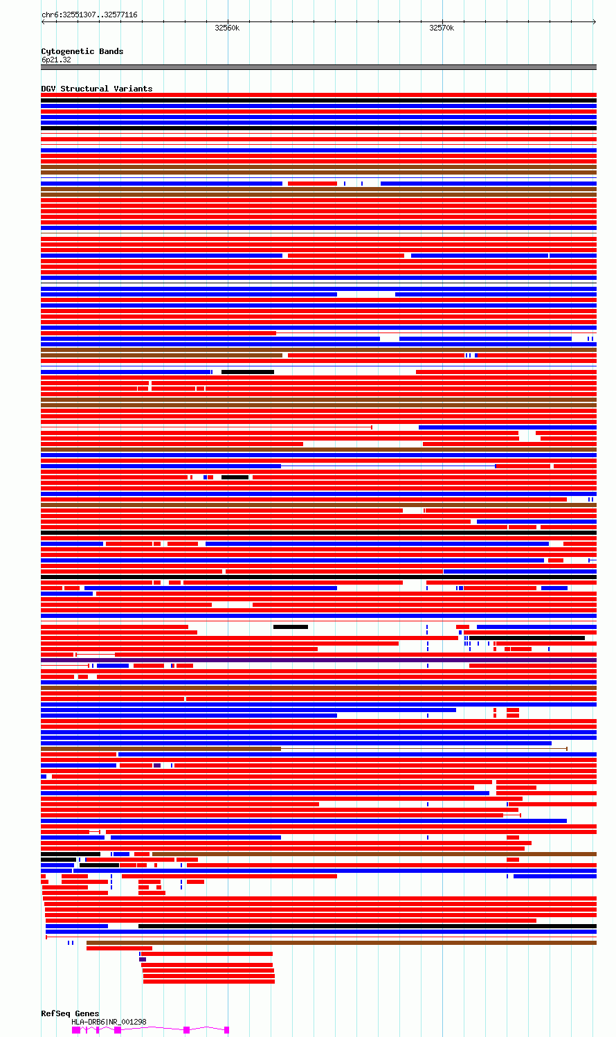 Variant DetailsVariant: essv6767526| Internal ID | 10175064 | | Landmark | | | Location Information | | | Cytoband | 6p21.32 | | Allele length | | Assembly | Allele length | | hg38 | 25810 | | hg19 | 25810 |