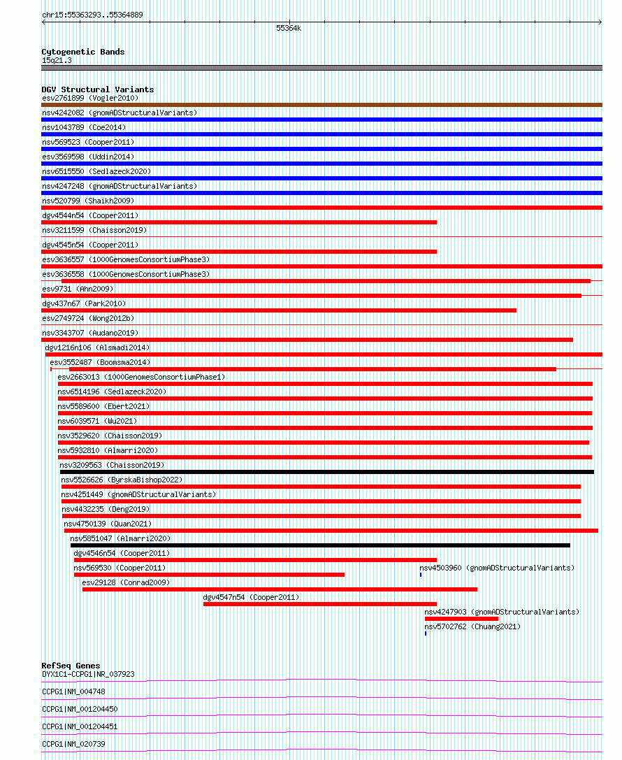 | | Variant Type | CNV deletion | | Copy Number | | | Allele State | | | Allele Origin | | | Probe Count | | | Validation Flag | | | Merged Status | S | | Merged Variants | esv2749724 | | Supporting Variants | | | Samples | SSM064 | | Known Genes | CCPG1, DYX1C1-CCPG1 | | Method | Sequencing | | Analysis | Breakdancer:4 times standard deviation,VariationHunter:4 times standard deviation and at least 3 supportting reads | | Platform | Illumina HiSeq 2000 | | Comments | | | Reference | Wong_et_al_2012b | | Pubmed ID | 23290073 | | Accession Number(s) | essv6768812
