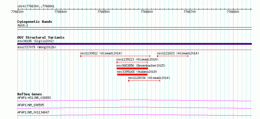 Variant DetailsVariant: essv6770273| Internal ID | 9830042 | | Landmark | | | Location Information | | | Cytoband | 4p16.1 | | Allele length | | Assembly | Allele length | | hg38 | 542 | | hg19 | 542 |
