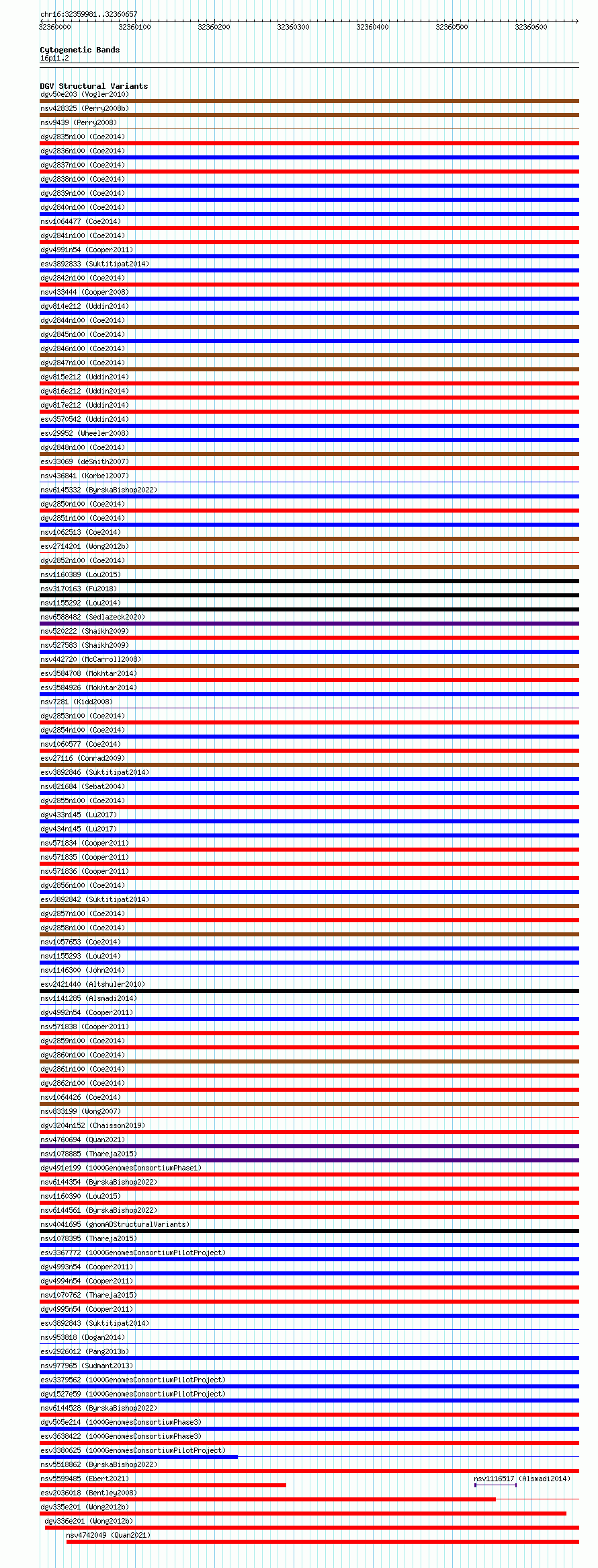 Variant DetailsVariant: essv6772579| Internal ID | 10178662 | | Landmark | | | Location Information | | | Cytoband | 16p11.2 | | Allele length | | Assembly | Allele length | | hg38 | 677 | | hg19 | 677 |