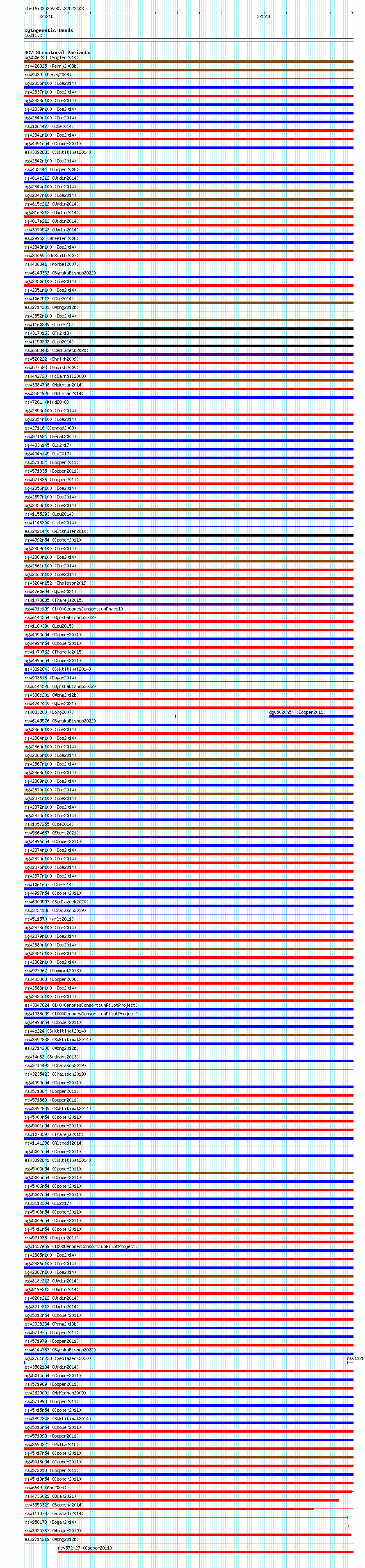 Variant DetailsVariant: essv6772582| Internal ID | 10178659 | | Landmark | | | Location Information | | | Cytoband | 16p11.2 | | Allele length | | Assembly | Allele length | | hg38 | 1504 | | hg19 | 1504 |