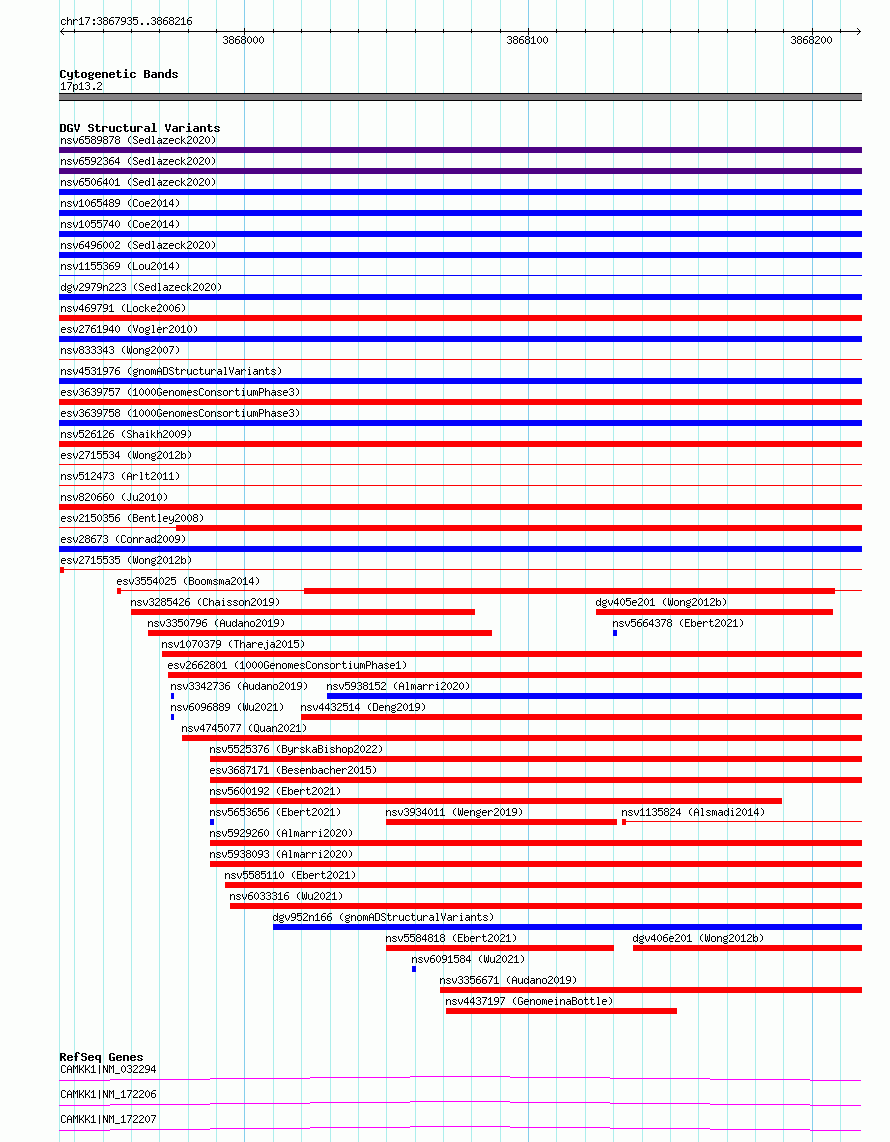 Variant DetailsVariant: essv6772735| Internal ID | 10178507 | | Landmark | | | Location Information | | | Cytoband | 17p13.2 | | Allele length | | Assembly | Allele length | | hg38 | 282 | | hg19 | 282 |