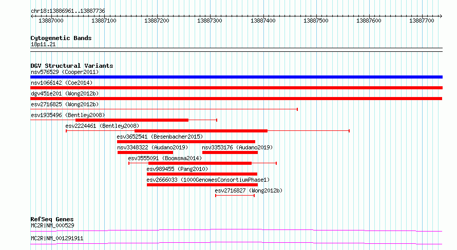 Variant DetailsVariant: essv6772866| Internal ID | 9831689 | | Landmark | | | Location Information | | | Cytoband | 18p11.21 | | Allele length | | Assembly | Allele length | | hg38 | 776 | | hg19 | 776 |