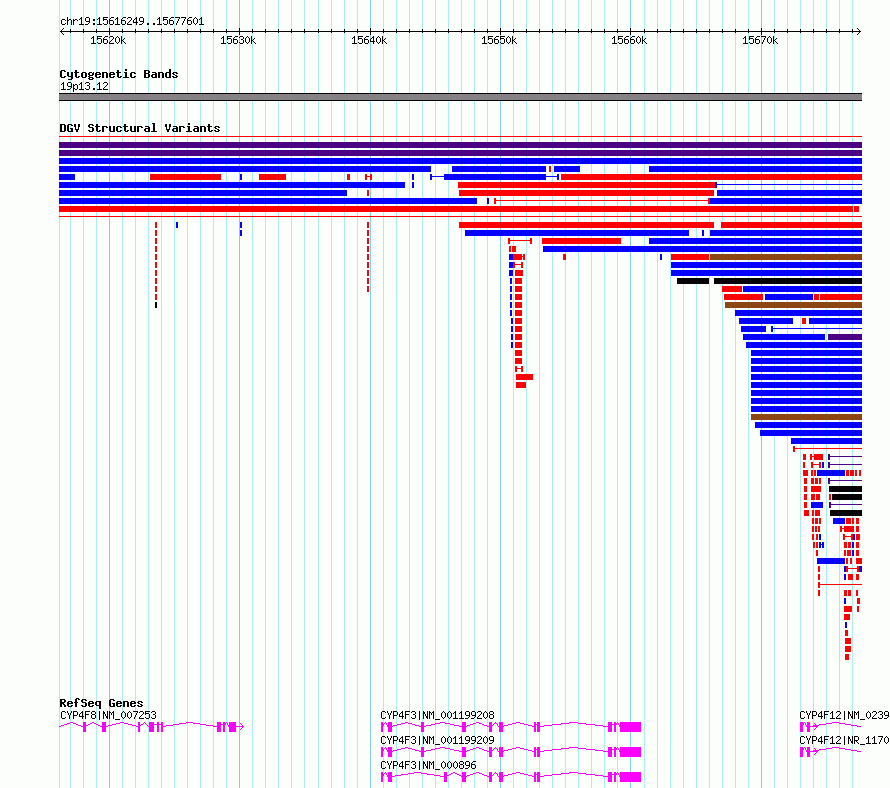 | | Variant Type | CNV deletion | | Copy Number | | | Allele State | | | Allele Origin | | | Probe Count | | | Validation Flag | | | Merged Status | S | | Merged Variants | esv2718235 | | Supporting Variants | | | Samples | SSM065 | | Known Genes | CYP4F12, CYP4F3, CYP4F8 | | Method | Sequencing | | Analysis | Breakdancer:4 times standard deviation,VariationHunter:4 times standard deviation and at least 3 supportting reads | | Platform | Illumina HiSeq 2000 | | Comments | | | Reference | Wong_et_al_2012b | | Pubmed ID | 23290073 | | Accession Number(s) | essv6773110