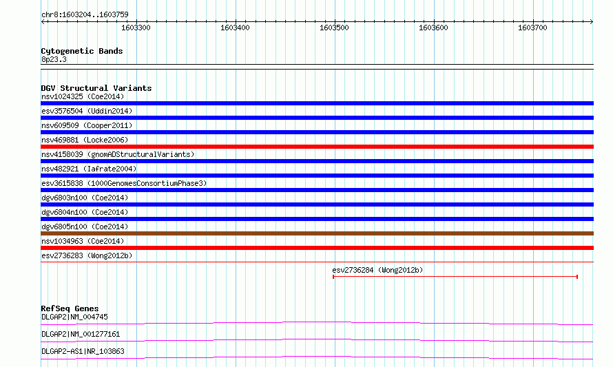 | Variant Type | CNV deletion | Copy Number | | Allele State | | Allele Origin | | Probe Count | | Validation Flag | | Merged Status | S | Merged Variants | esv2736283 | Supporting Variants | | Samples | SSM066 | Known Genes | DLGAP2, LOC100507435 | Method | Sequencing | Analysis | Breakdancer:4 times standard deviation,VariationHunter:4 times standard deviation and at least 3 supportting reads | Platform | Illumina HiSeq 2000 | Comments | | Reference | Wong_et_al_2012b | Pubmed ID | 23290073 | Accession Number(s) | essv6775098