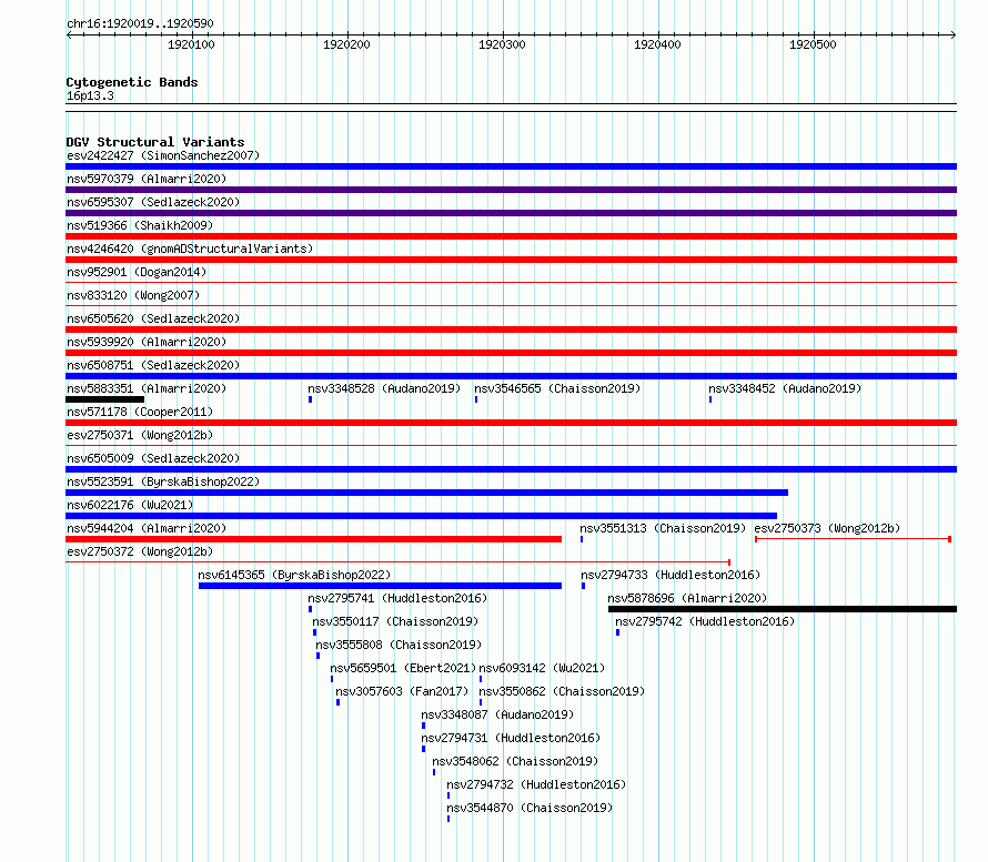 Variant DetailsVariant: essv6776137| Internal ID | 10182006 | | Landmark | | | Location Information | | | Cytoband | 16p13.3 | | Allele length | | Assembly | Allele length | | hg38 | 572 | | hg19 | 572 |