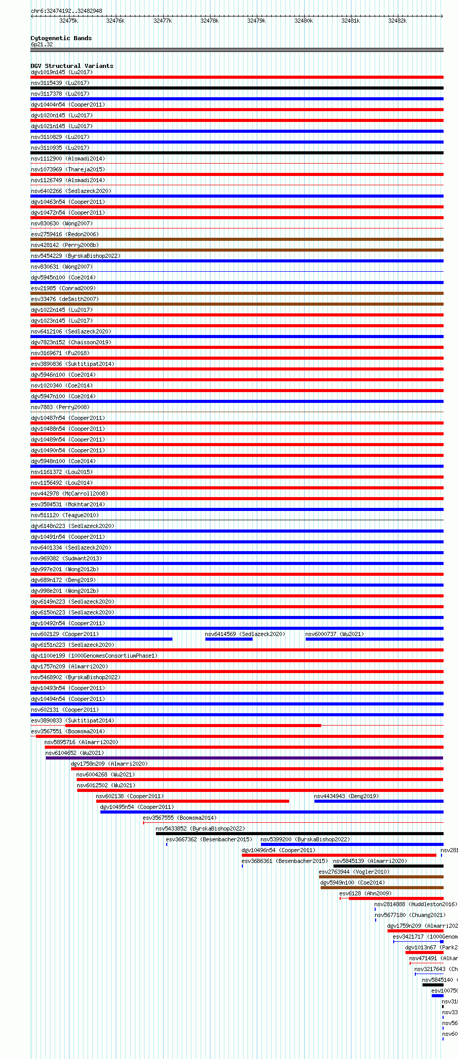 Variant DetailsVariant: essv6778145| Internal ID | 10183812 | | Landmark | | | Location Information | | | Cytoband | 6p21.32 | | Allele length | | Assembly | Allele length | | hg38 | 8757 | | hg19 | 8757 |