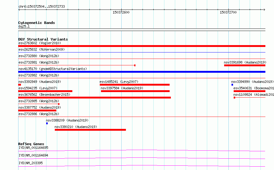 Variant DetailsVariant: essv6778303Internal ID | 9837268 | Landmark | | Location Information | | Cytoband | 6q25.1 | Allele length | Assembly | Allele length | hg38 | 230 | hg19 | 230 |