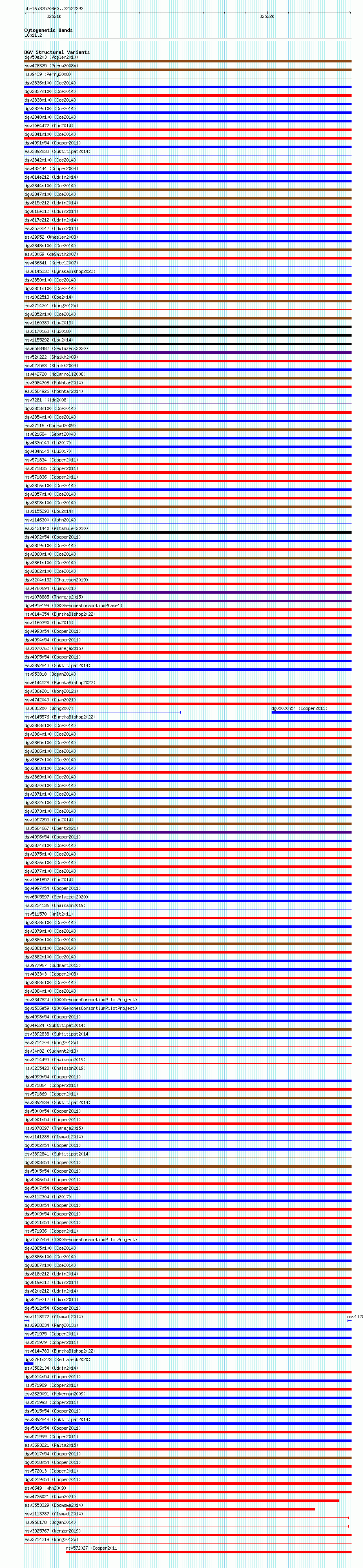 Variant DetailsVariant: essv6779953| Internal ID | 10185438 | | Landmark | | | Location Information | | | Cytoband | 16p11.2 | | Allele length | | Assembly | Allele length | | hg38 | 1534 | | hg19 | 1534 |