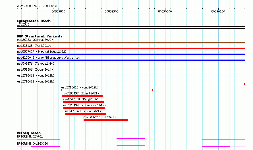Variant DetailsVariant: essv6780193| Internal ID | 10185654 | | Landmark | | | Location Information | | | Cytoband | 17q25.3 | | Allele length | | Assembly | Allele length | | hg38 | 427 | | hg19 | 427 |