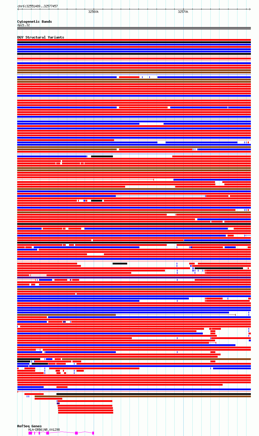 Variant DetailsVariant: essv6782195| Internal ID | 10186783 | | Landmark | | | Location Information | | | Cytoband | 6p21.32 | | Allele length | | Assembly | Allele length | | hg38 | 25969 | | hg19 | 25969 |
