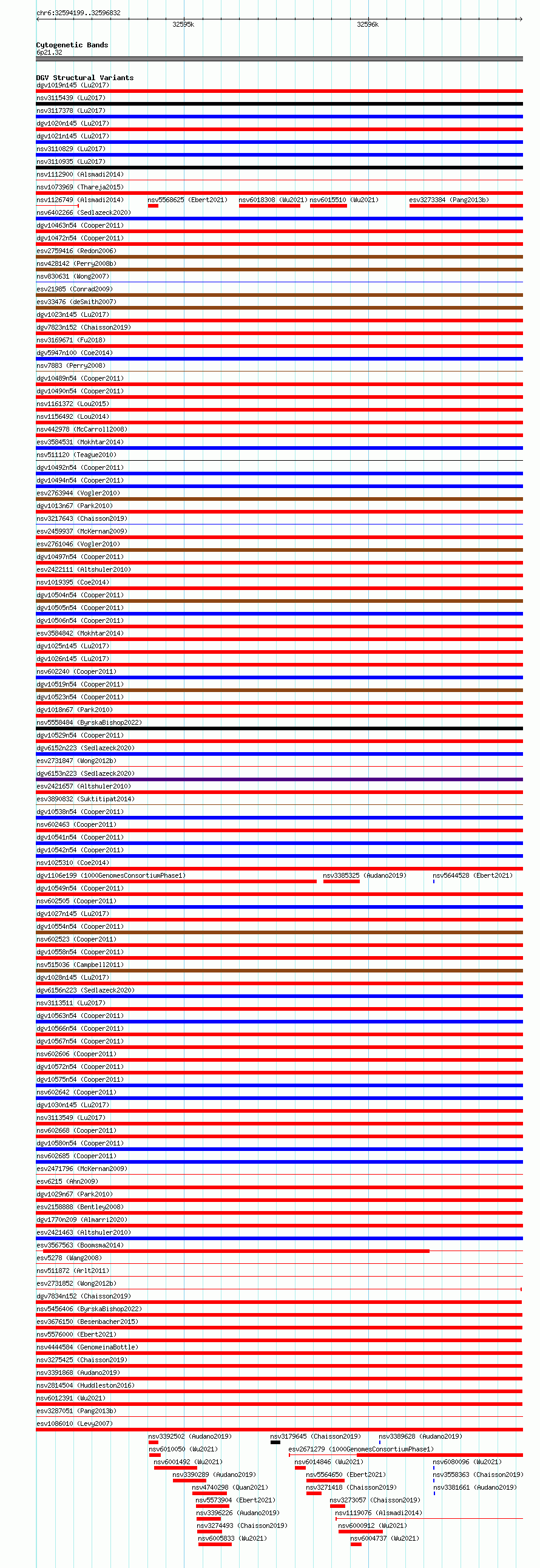 Variant DetailsVariant: essv6782197| Internal ID | 10186785 | | Landmark | | | Location Information | | | Cytoband | 6p21.32 | | Allele length | | Assembly | Allele length | | hg38 | 2634 | | hg19 | 2634 |