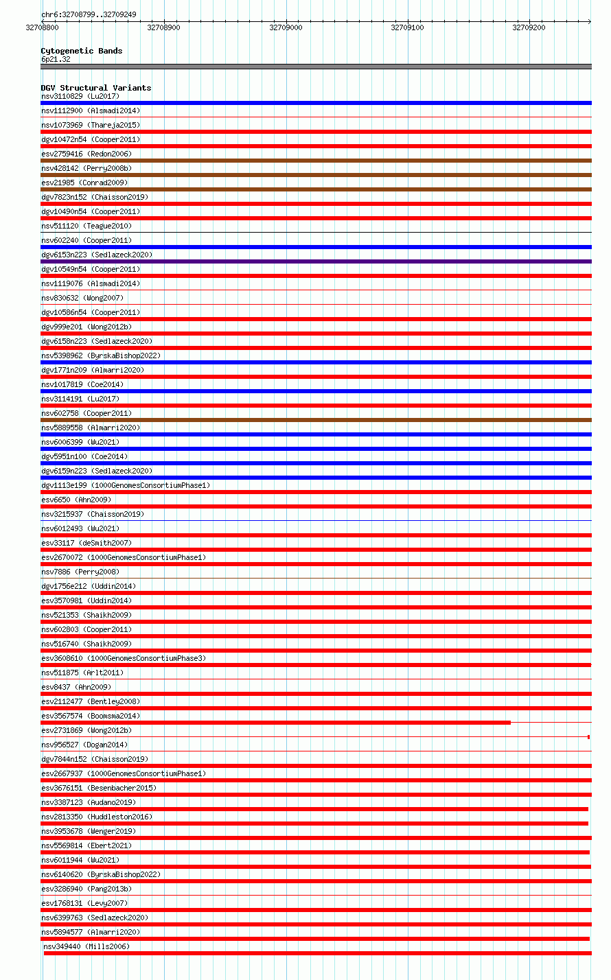 Variant DetailsVariant: essv6782215| Internal ID | 10186801 | | Landmark | | | Location Information | | | Cytoband | 6p21.32 | | Allele length | | Assembly | Allele length | | hg38 | 451 | | hg19 | 451 |