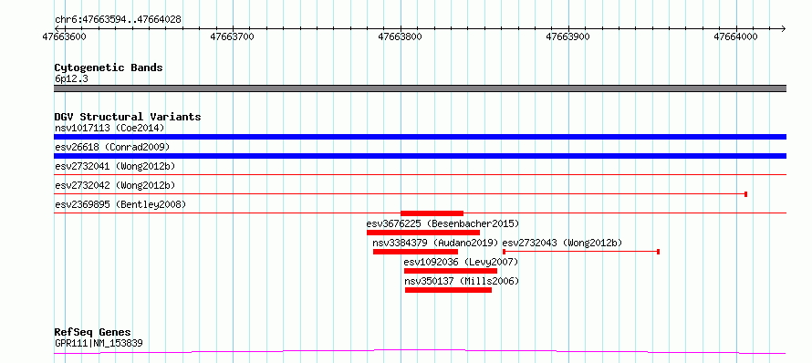 Variant DetailsVariant: essv6782231| Internal ID | 9840130 | | Landmark | | | Location Information | | | Cytoband | 6p12.3 | | Allele length | | Assembly | Allele length | | hg38 | 435 | | hg19 | 435 |