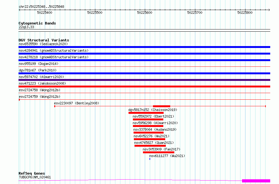 Variant DetailsVariant: essv6783410| Internal ID | 10002642 | | Landmark | | | Location Information | | | Cytoband | 22q13.33 | | Allele length | | Assembly | Allele length | | hg38 | 501 | | hg19 | 501 |