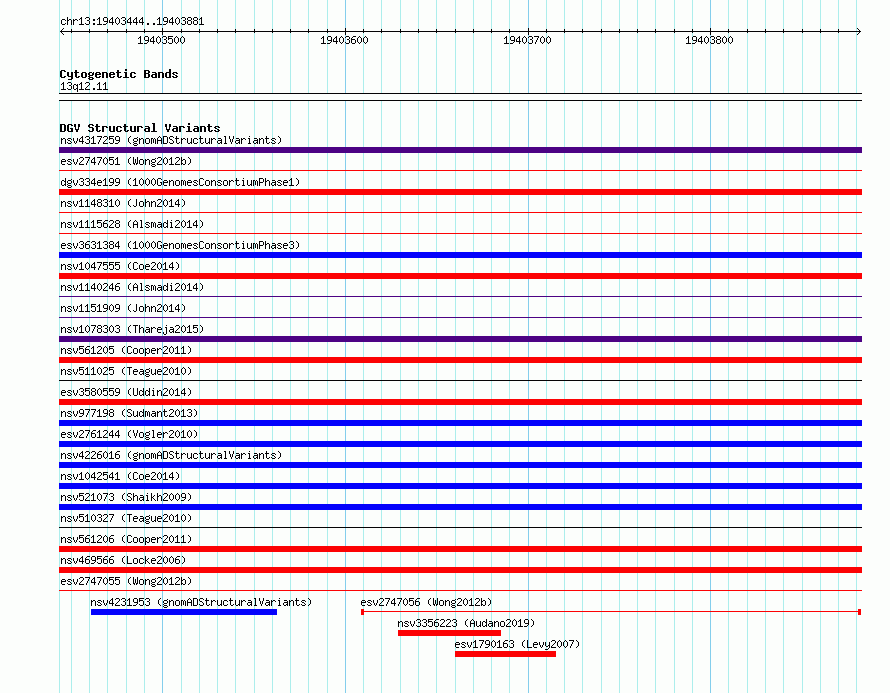Variant DetailsVariant: essv6783673| Internal ID | 9840540 | | Landmark | | | Location Information | | | Cytoband | 13q12.11 | | Allele length | | Assembly | Allele length | | hg38 | 438 | | hg19 | 438 |