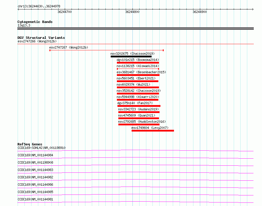| | Variant Type | CNV deletion | | Copy Number | | | Allele State | | | Allele Origin | | | Probe Count | | | Validation Flag | | | Merged Status | S | | Merged Variants | esv2747266 | | Supporting Variants | | | Samples | SSM068 | | Known Genes | CCDC169, CCDC169-SOHLH2 | | Method | Sequencing | | Analysis | Breakdancer:4 times standard deviation,VariationHunter:4 times standard deviation and at least 3 supportting reads | | Platform | Illumina HiSeq 2000 | | Comments | | | Reference | Wong_et_al_2012b | | Pubmed ID | 23290073 | | Accession Number(s) | essv6783699