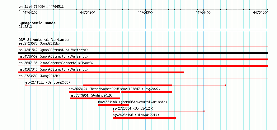 Variant DetailsVariant: essv6784031| Internal ID | 9655891 | | Landmark | | | Location Information | | | Cytoband | 21q22.3 | | Allele length | | Assembly | Allele length | | hg38 | 432 | | hg19 | 432 |