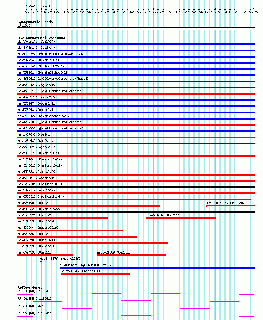 Variant DetailsVariant: essv6784231| Internal ID | 10188913 | | Landmark | | | Location Information | | | Cytoband | 17p13.3 | | Allele length | | Assembly | Allele length | | hg38 | 190 | | hg19 | 190 |