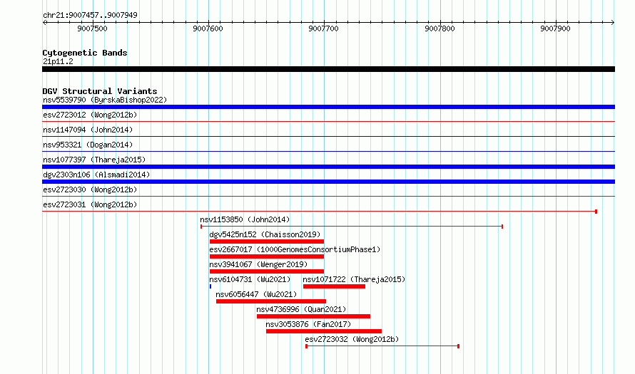 Variant DetailsVariant: essv6784829| Internal ID | 10188667 | | Landmark | | | Location Information | | | Cytoband | 21p11.2 | | Allele length | | Assembly | Allele length | | hg38 | 493 | | hg19 | 493 |