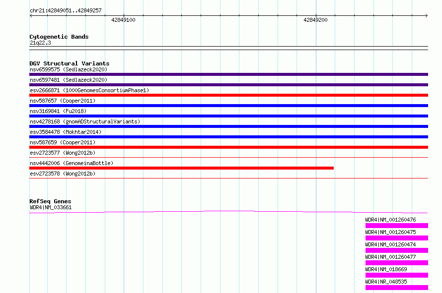 | | Variant Type | CNV deletion | | Copy Number | | | Allele State | | | Allele Origin | | | Probe Count | | | Validation Flag | | | Merged Status | S | | Merged Variants | esv2723578, esv2723577 | | Supporting Variants | | | Samples | SSM068 | | Known Genes | WDR4 | | Method | Sequencing | | Analysis | Breakdancer:4 times standard deviation,VariationHunter:4 times standard deviation and at least 3 supportting reads | | Platform | Illumina HiSeq 2000 | | Comments | | | Reference | Wong_et_al_2012b | | Pubmed ID | 23290073 | | Accession Number(s) | essv6784891