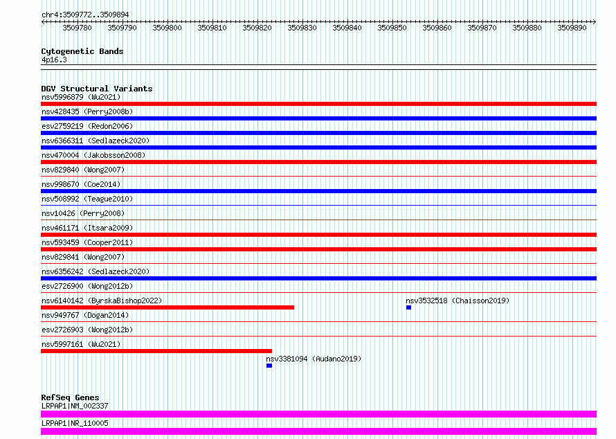 Variant DetailsVariant: essv6785790| Internal ID | 10190693 | | Landmark | | | Location Information | | | Cytoband | 4p16.3 | | Allele length | | Assembly | Allele length | | hg38 | 123 | | hg19 | 123 |